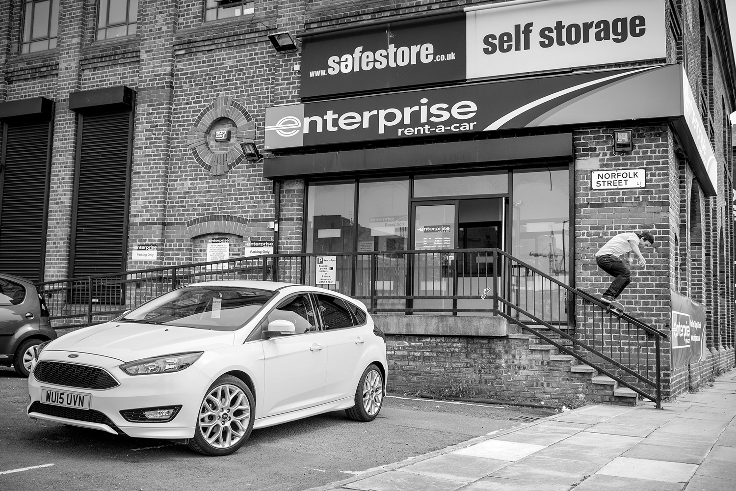 Heading up towards a small courtyard saw wheels grace banked glass windows already adorned in wheel marks. Jimmy Boyes decided that kick turns on the surface weren’t enough and aided by John Dalton, made his way to the roof of the building that hosted the window everyone was skating below. After a few minutes the Durham Apache likely realised the looming chunk at the base of the bank would probably claim him and decided to give this one hectic drop in a miss… Luckily, as five minutes later the police arrived and onto the next spot we were.