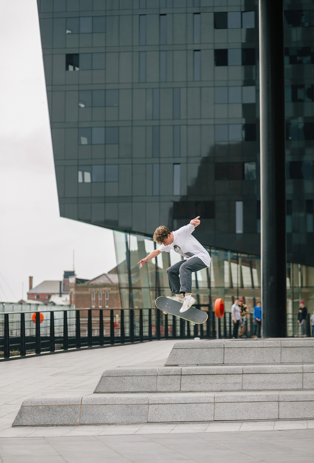 Last spot of the day called for some of the most haggard banks I’ve had the pleasure of skating (Scaff Banks – Ed). Despite old concrete, cracks and grass making for an uncomfortable run up, the vibes at this spot where great as Jimmy delivered frontside and backside grinds before popping one of his trademark ‘sproings’ to tail into the bank. Rauri reeled off backside ollie after backside ollie for Ollie Birch whose lack of satisfaction and calls of ‘one more’ drove Rauri to the edge. Mirrored by John Dalton who boosted a frontside equivalent for Ollie’s lense shortly after that. Fellow Lost Artist Luke Fletcher laid down a banging frontside no comply and crail slide to round off the session before everyone headed back to the store for the evenings screening of Propeller and Owain John’s Grow Up.