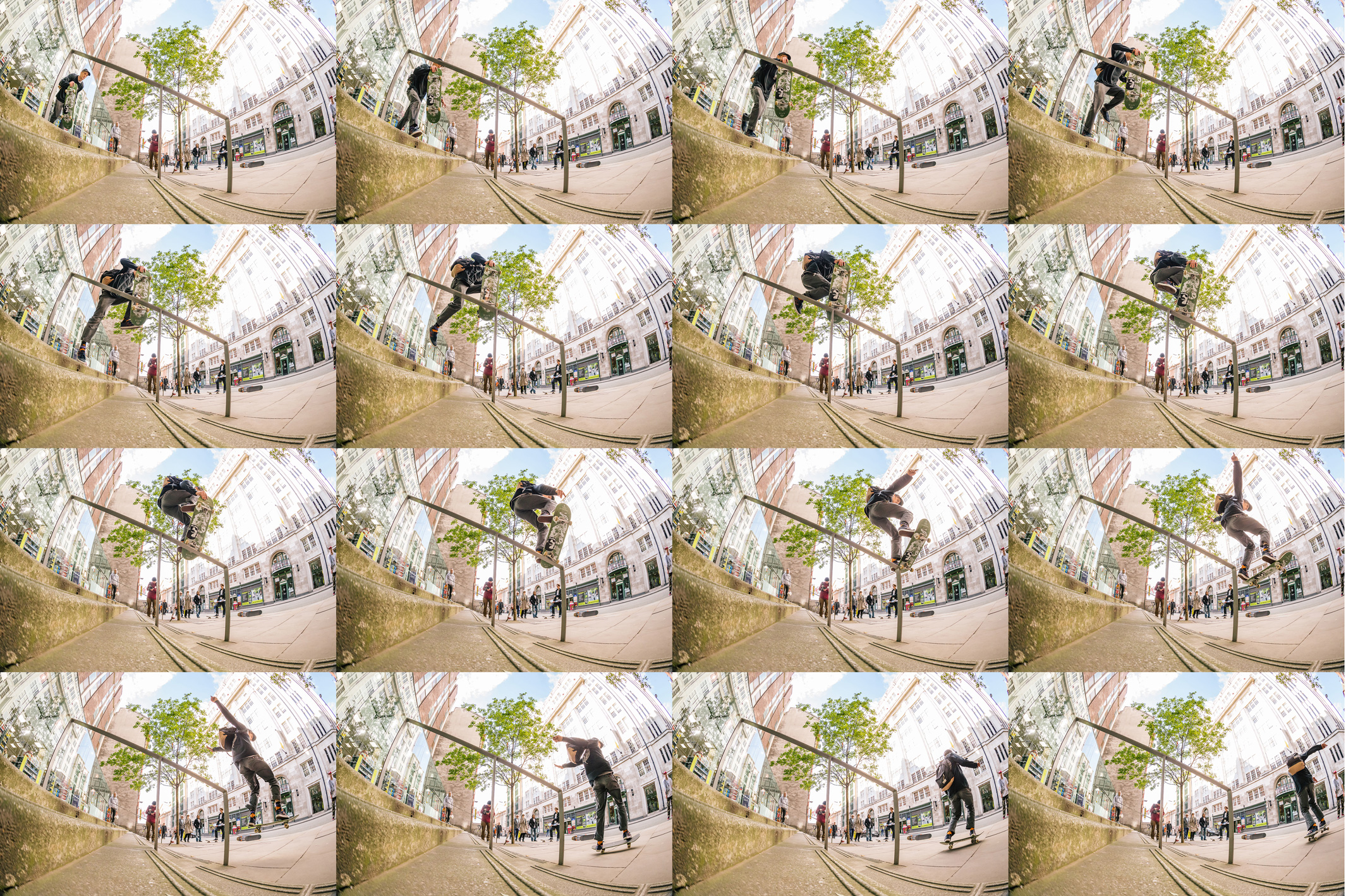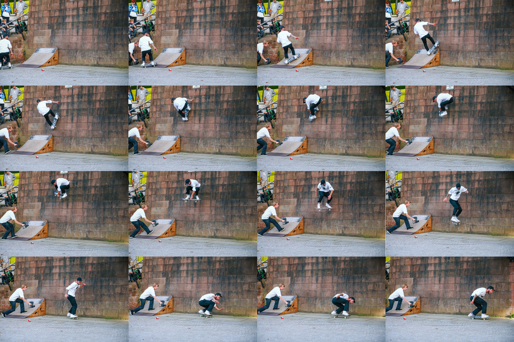 It turns out that persuasion wasn’t necessary as we had Harry Lintell. Starting out by throwing his board onto the rail, the hype kept growing as he went a bit further each time. Eventually Harry made it to the top, I don’t need to dramatise how heart in mouth it was to watch Harry attempt the rail as anyone that sees the photo or footage will feel it. But there is literally no safe escape. Slip back – you’re fucked. Jump to the bottom – you’re fucked. Jump to the side – you’re really fucked. Since Woody originally fought the good fight the only known trick delivered on it was from Australia’s Blake Harris and, not to dismiss his feeble grind entirely, but riding in and away from this with the help from wood does make things easier. Anyway, Harry being Harry stuck every attempt and five goes later, with nothing but one push for speed, rolled away on the awful brick surface to be met with roars of applause.