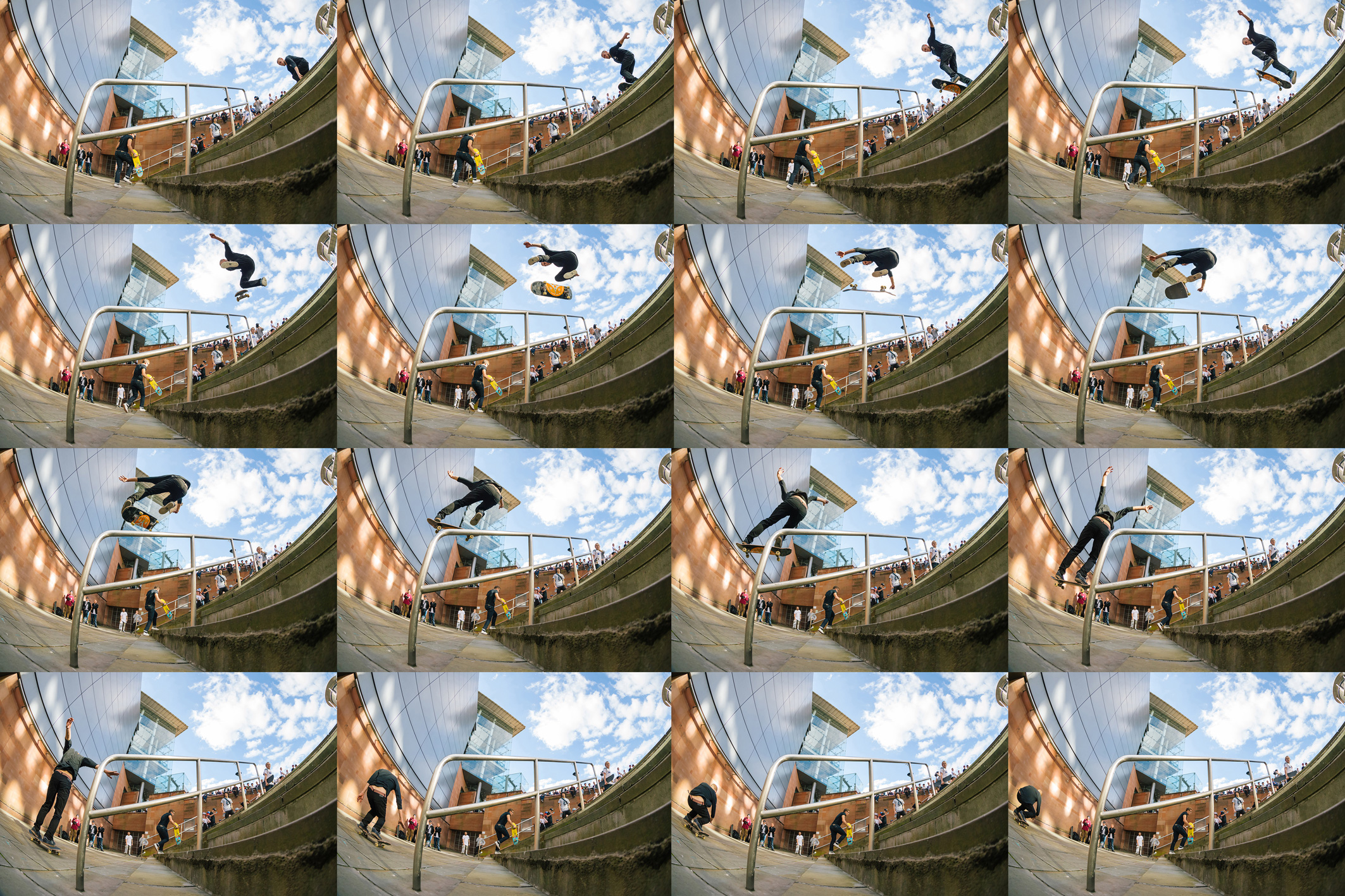 With the weather perfect, the only thing looming overhead was the question of how long until people began skating Urbis’ ‘stairset that should not be a stairset’ – the challenge of which is evident by both how little run up there is and how few tricks have been done down it. Never wasting any time when there’s Tinder swipes to be had once hammers have been delivered, recent Haunts recipient Robert ‘Rooney’ Woodward flung his reborn-blonde self down the set first go. Others chose the more sensible path onto the bottom step, with countless spills taking place as wheelbite took hold and bodies were flung from a moment of triumph down the last step. Eddie Belvedere delivered from first to third with a picturesque kickflip and Nev brought his camo clad quick footed co-ordination by popping down and backside 180ing off before battling a bigspin for the rest of the session. Bystanders joined the crowd in awe as Rasheed Osman nailed a frontside shove down to the bottom step then quickly set his mind to a hardflip which, while not landed, was stuck near enough every time and offered up some spectacular slams.