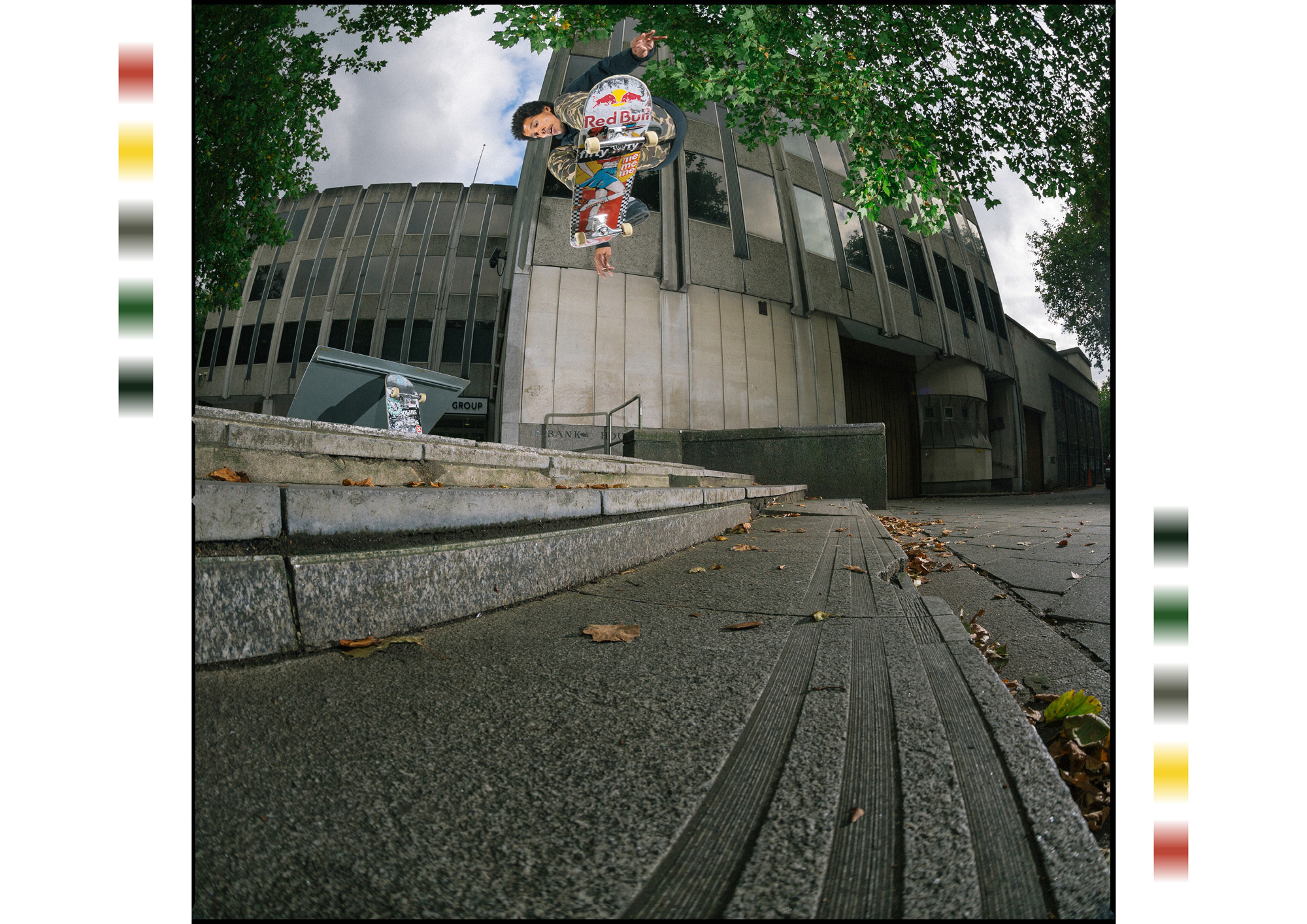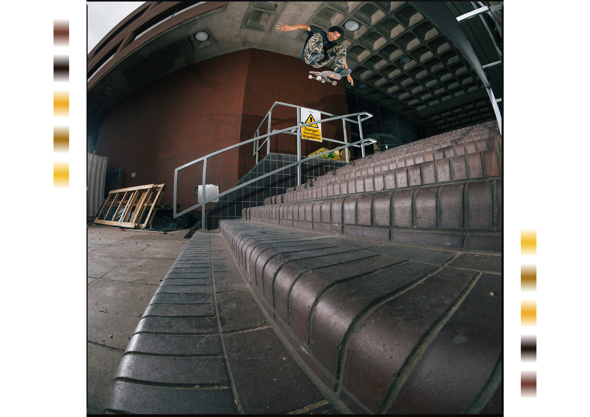 I first became aware of Korahn around 2003. I remember being in Fifty Fifty watching footage of a little kid skating off the second block at Lloyds (a spot he went on to OWN) with power and board control way beyond his years. Not long after, Korahn started working in Fifty Fifty. Picking him up from the shop during his lunch hour to shoot his First Light for Sidewalk; he said he wanted to check a set of eleven stairs up at Bristol University and I was dubious as to whether we could get there, shoot a photo and get back in time for Korahn to start work again. I needn’t have worried. He frontside flipped the stairs perfectly second try and we were back in the shop fifteen minutes later…