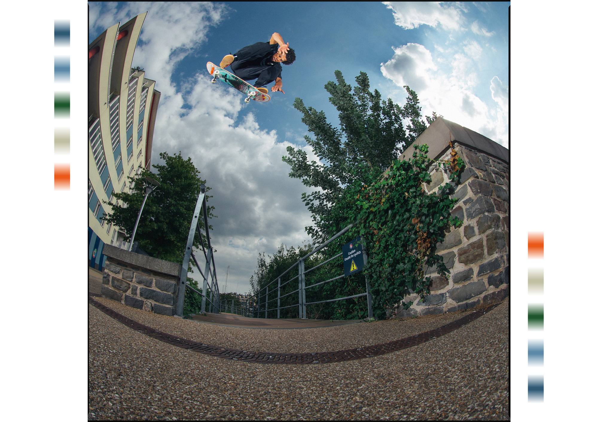 I was trying to bigflip this set by the water. People were waiting because it was the last day and I was just wasting time I’d been trying it for so long. There were loads of random people watching so I couldn’t get angry because I didn’t want to be a dick. So I was just holding it in. Then just one time it got too much, I just picked my board up and launched it in the river. It was the dumbest thing. I remember some guy in a Danish accent just like “anticlimax yah!” It was so funny. Then with the switch backside flip, I’d been drinking loads, proper wavey watching people skate. I was trying to just skate flat ground and found it so hard, I was all over the place but I think with switch backside flips you just ride backwards and jump and your foot kind of rolls off and does it. So I chucked one down, just as a joke. Then I got too close and was sucked in. So I tried it a few times and eventually got it. But it was weird because I was pretty wavey. It was fun, it was a lucky one, it’s one of my favourite tricks in the part as well.