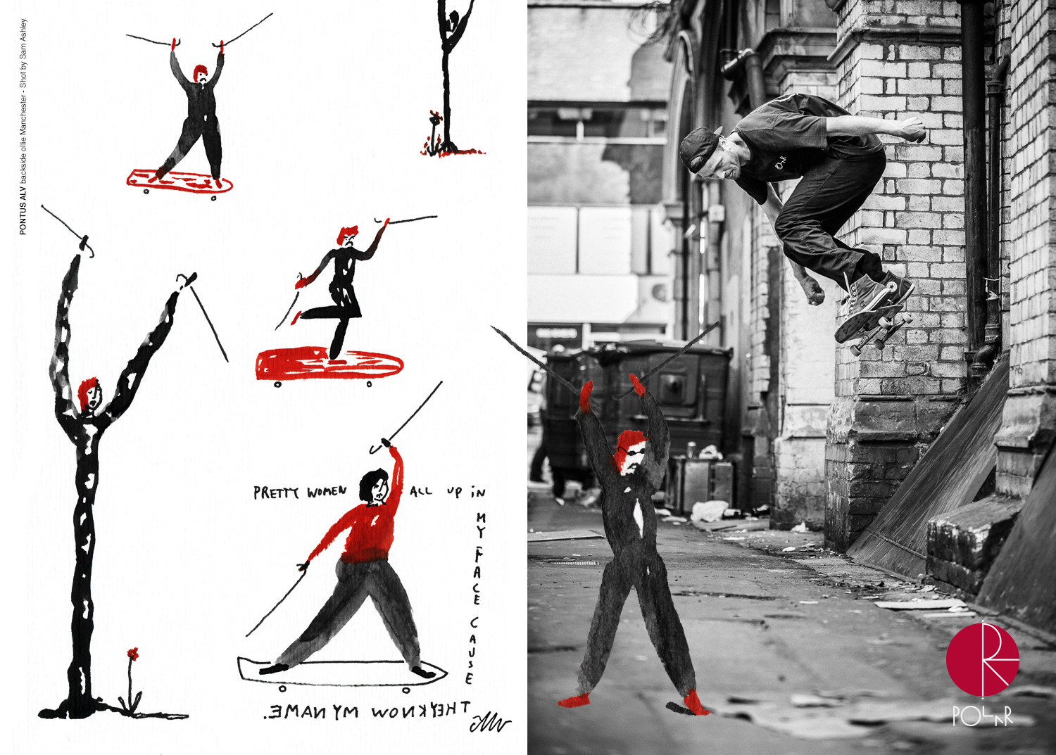 As Pontus Alv’s brainchild, Polar has quickly grown from a niche Swedish brand to becoming one of the leading entities in the small brand resurgence the skateboard industry has seen over the last few years. Alv’s vision for the brand has always relied on creativity rather than technicality along with a heavy DIY ethos. This approach is shared by all affiliates of the company; from the team riders to the artists and encouraged across their video output and board graphics. Alv’s own artwork and photography has featured on various boards since the company’s inception while his Happy/Sad motif has practically taken on a life of it’s own; becoming as synonymous with the brand as its country of origin. Alongside Alv, Jacob Ovgren is a key figure within the company providing a cartoony and more light-hearted tone. Stefan Narancic’s imagery, with themes and inspiration ranging from old statues to space and science fiction, also frequently appears across boards and clothing, while more recently artist AMTK was brought in, bringing another new but fitting approach to the company’s imagery.