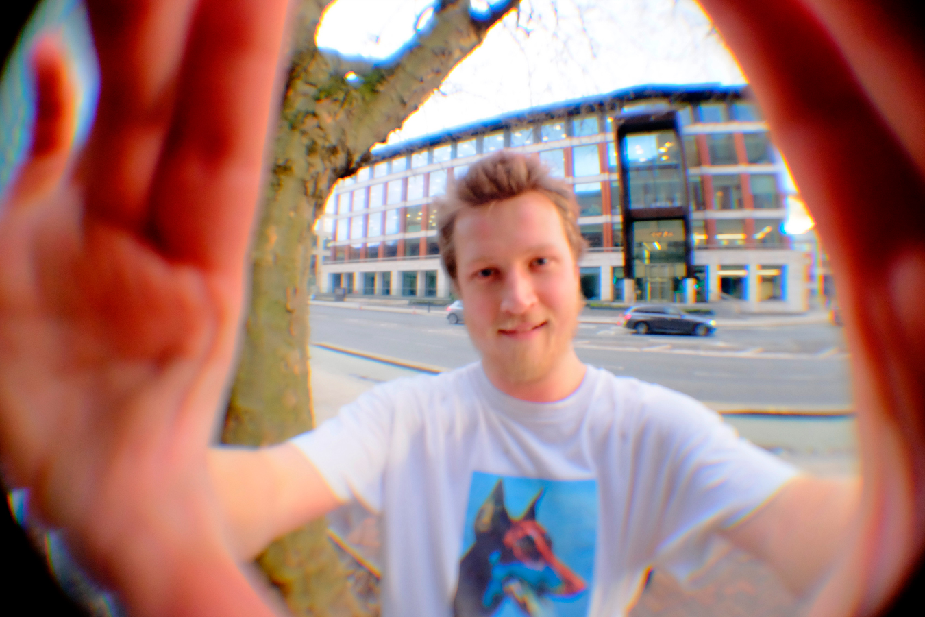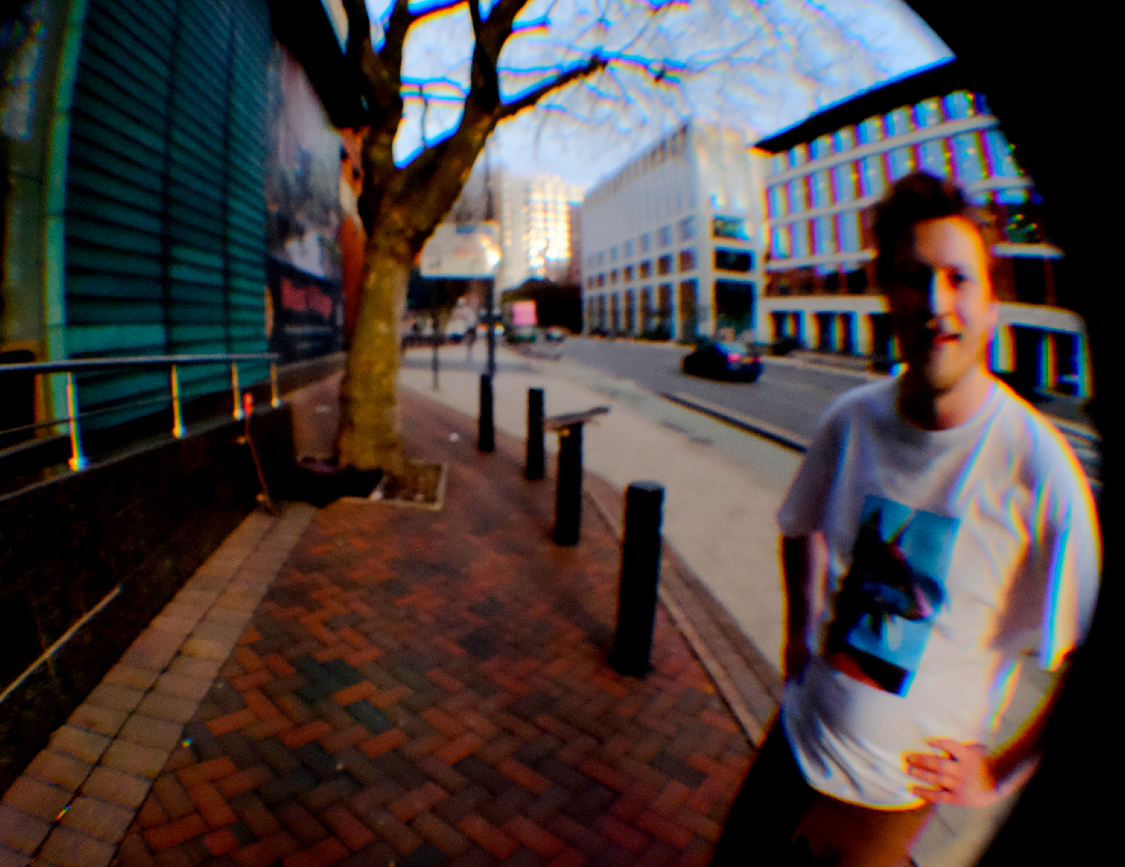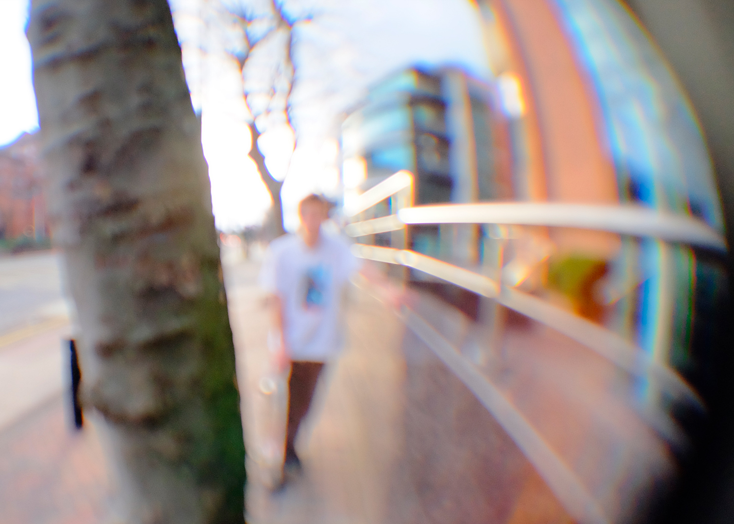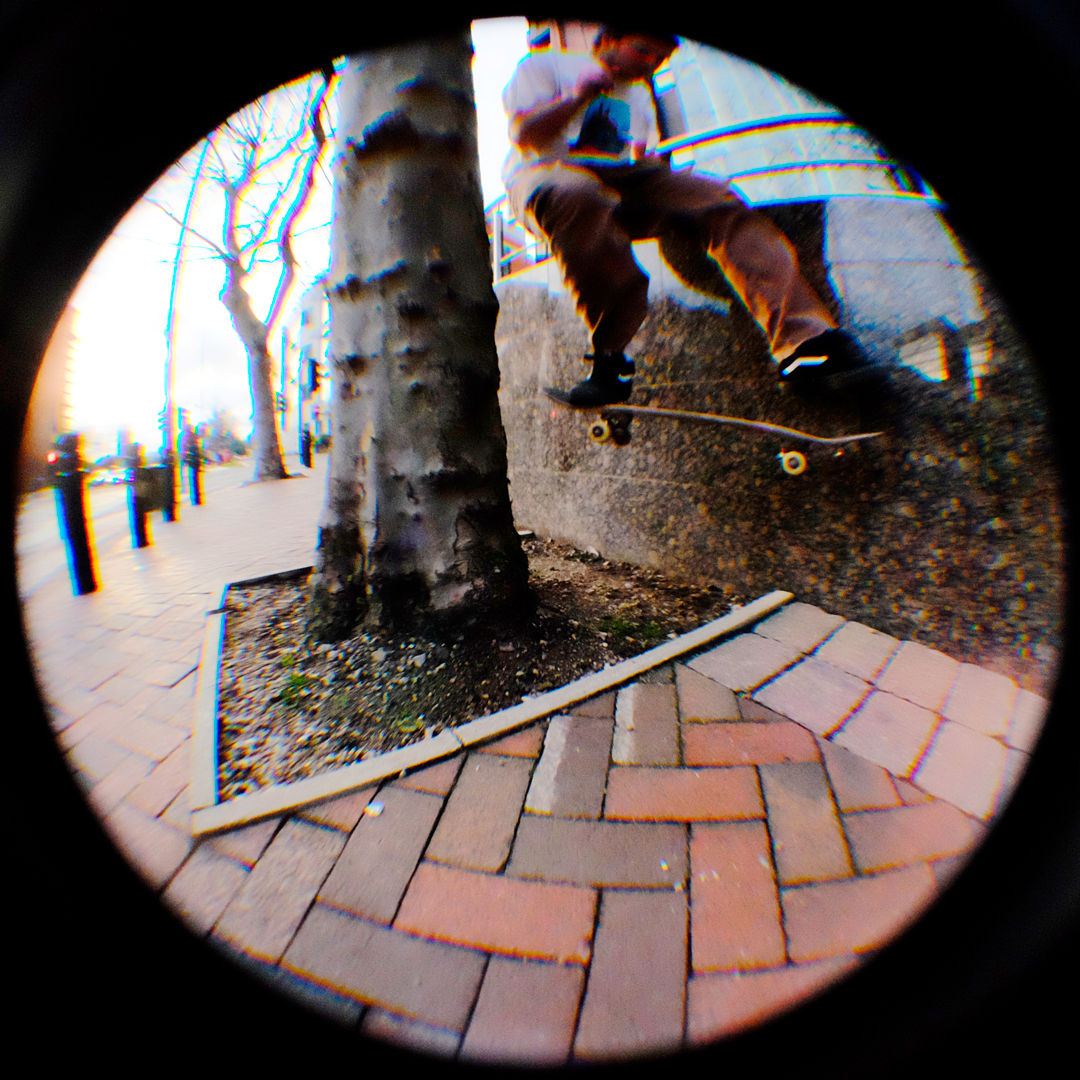 After filming my buddy, Joe, wallride nollie a thread-the-needle spot a handful of times, we took advantage of him having it dialled and tried to a shoot a few through his VX1000 fisheye. It was pretty much impossible get anything properly in focus, the colours are kinda wild, but it was very fun.