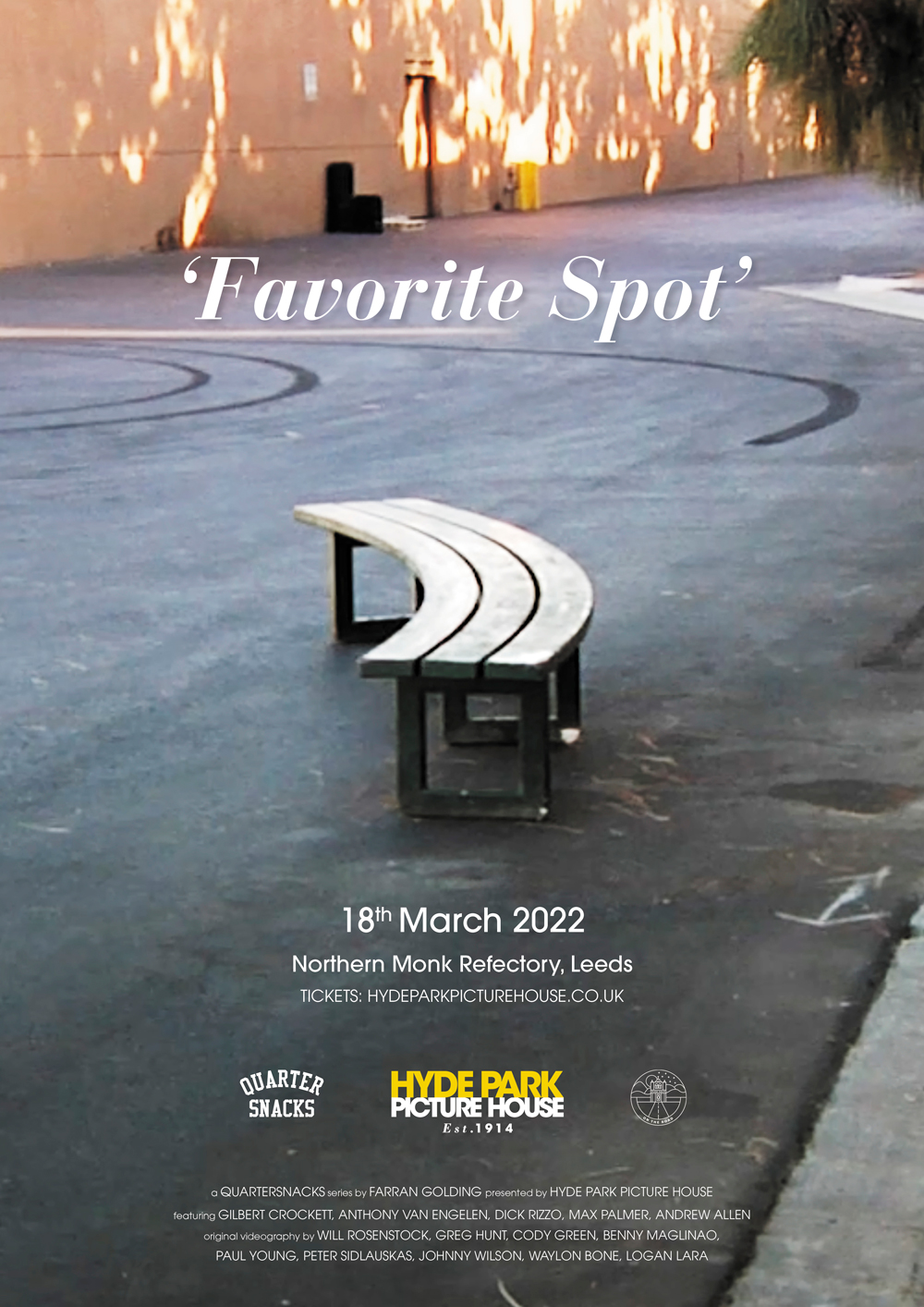 Produced by Leeds-based journalist Farran Golding for New York publication, Quartersnacks, this screening brings together all five Favorite Spot instalments, depicting the nuanced and often humorous relationship skateboarders have with the wider world.”