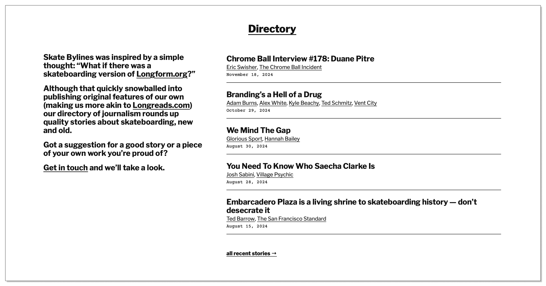 Skate Bylines includes a curated online directory of high quality journalism about skateboarding published in endemic outlets and wider-circulation media.